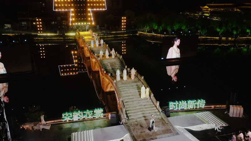 五洞桥畔,万人空巷。伴随悠扬的音乐和绚丽的灯光,模特们身着新裁宋服,自五洞桥西侧鱼贯而出,踏着不断变换的光影,犹如百年前的宋人跨过历史长河,翩然而至,灯光、湖景、人影交错,为全场观众营造了一场古今对话的视觉盛宴。